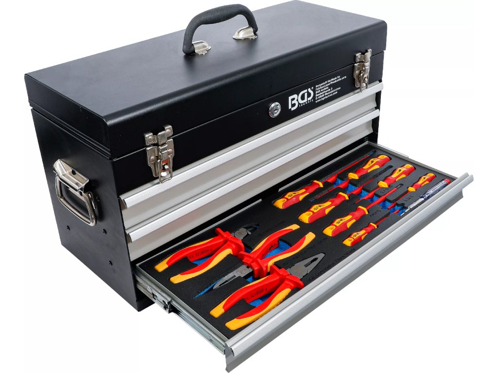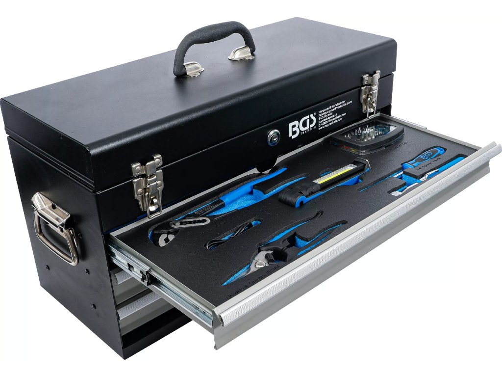 Sada obsahuje širokou škálu ručního nářadí včetně izolovaných nástrojů testovaných dle normy DIN EN/IEC 60900. Vše je uloženo v pevném kovovém kufru se 3 zásuvkami a horní přihrádkou s víkem.