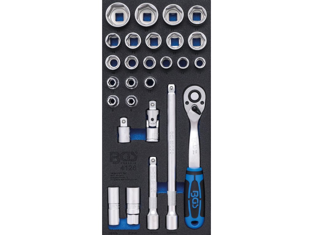 Pěnová vložka o rozměrech (š x h x v) 189 x 408 x 32 mm obsahuje gola sadu 27 ks se čtyřhranem 1/2".