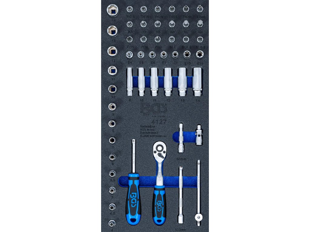 Pěnová vložka o rozměrech (š x h x v) 189 x 408 x 48 mm obsahuje gola sadu 50 ks se čtyřhranem 1/4".