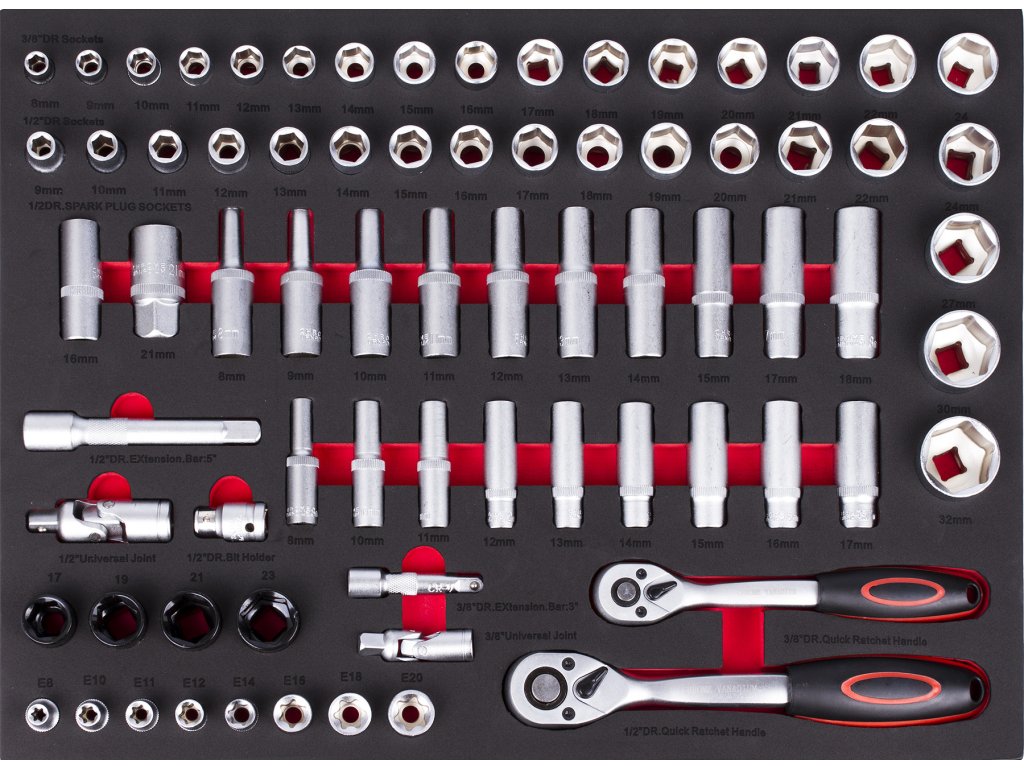 Gola sada 1/2", 3/8", 74 ks v pěnové výplni do dílenského vozíku.