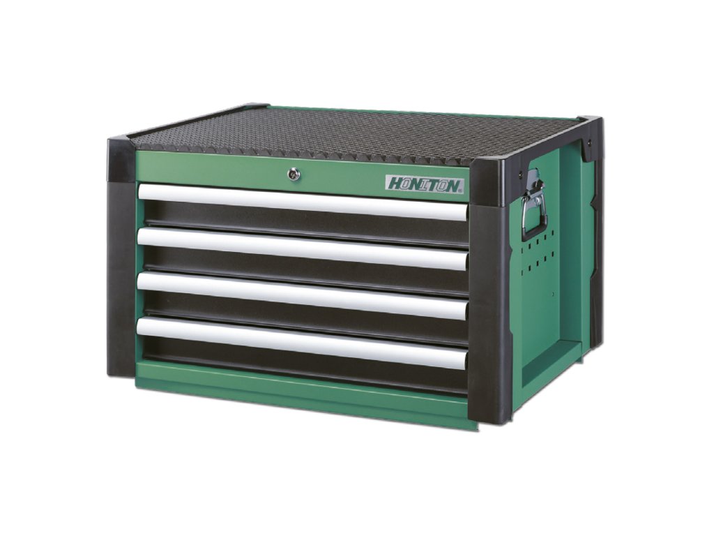 Kovový montážní skříň na nářadí se 4 zásuvkami.. Zásuvky na kuličkových ložiskách lze vysunout do 40cm. Horní pracovní plocha i zásuvky jsou vypodloženy protiskluzovou podložkou. Součástí jsou uzamykatelné 4 nízké zásuvky. Lze použít jako nástavba k vozíku HA103Doplňkové parametry