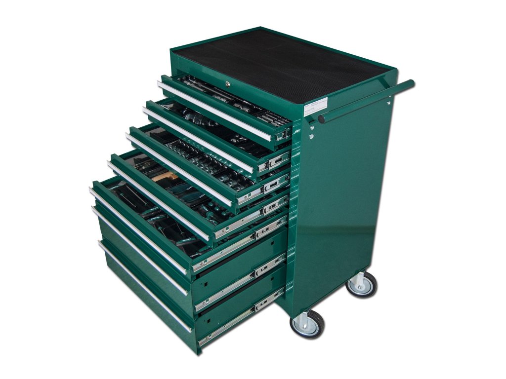 Kovový montážní vozík na nářadí se 7 zásuvkami. Dvě pevná a dvě otočná kola s poziční brzdou. Zásuvky s kuličkovými ložisky lze vysunout do 40 cm. Horní pracovní plocha i zásuvky jsou vypodloženy protiskluzovou podložkou. Držadlo pro manipulaci s vozíkem lze umístit z pravé i levé strany. Součástí je 5 nízkých a 2 vysoké uzamykatelné zásuvky.Doplňkové parametry