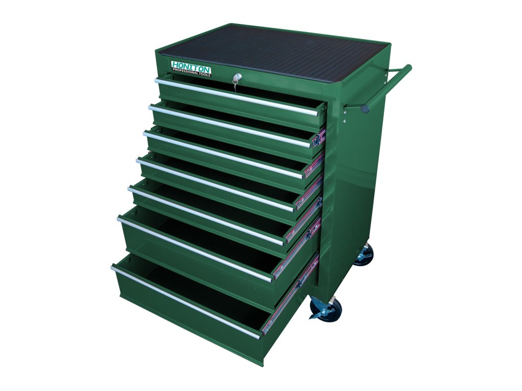 Kovový montážní vozík na nářadí se 7 zásuvkami. Má dvě pevná a dvě otočná kolečka s pozičníbrzdou. Zásuvky na kuličkových ložiskách lze vysunout 40cm. Horní pracovní plocha i zásuvky jsou vypodloženyprotiskluzovou podložkou. Držadlo pro manipulaci s vozíkem lze umístit z pravé nebo levé strany.Součástí jsou uzamykatelné zásuvky (5 nízkých a 2 vysoké zásuvky).Doplňkové parametry
