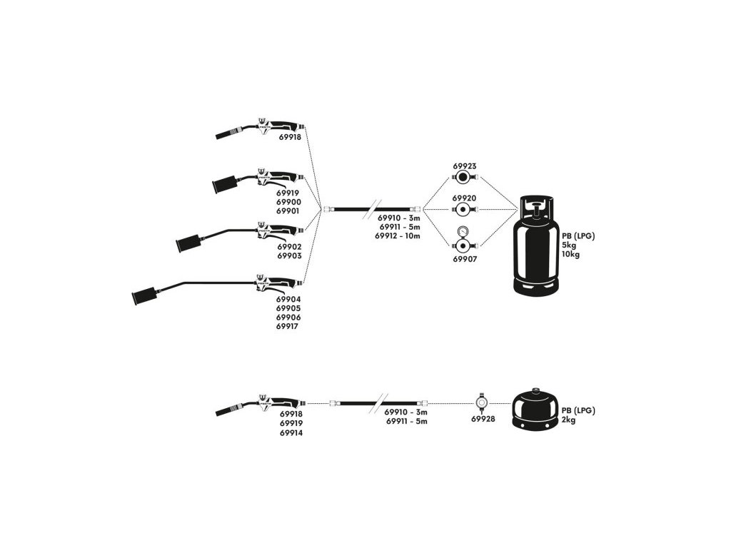 - napojení přes regulátory 69923, 69920, 69907 na lahve 5, 10, 33 kg