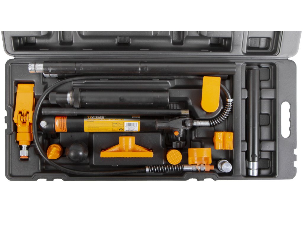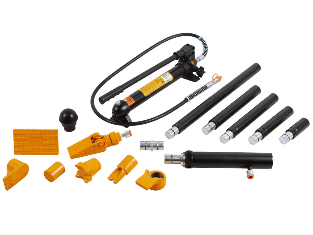 Tato přenosná sada uložená v plastovém kufru s kolečky se skládá z hydraulického válce a 13ti dílů příslušenství. Rozpínací síla pumpy je 10 tun a zdvih pístu 150 mm.