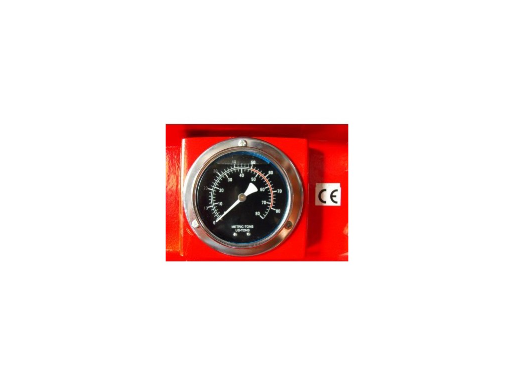 O návrat do výchozí polohy se stará dvojice silných pružin, které zajišťují rychlý a plynulý pohyb horní části. Lis je dále vybaven tlakoměrem a navijákem pro snadný posun pracovního stolu.