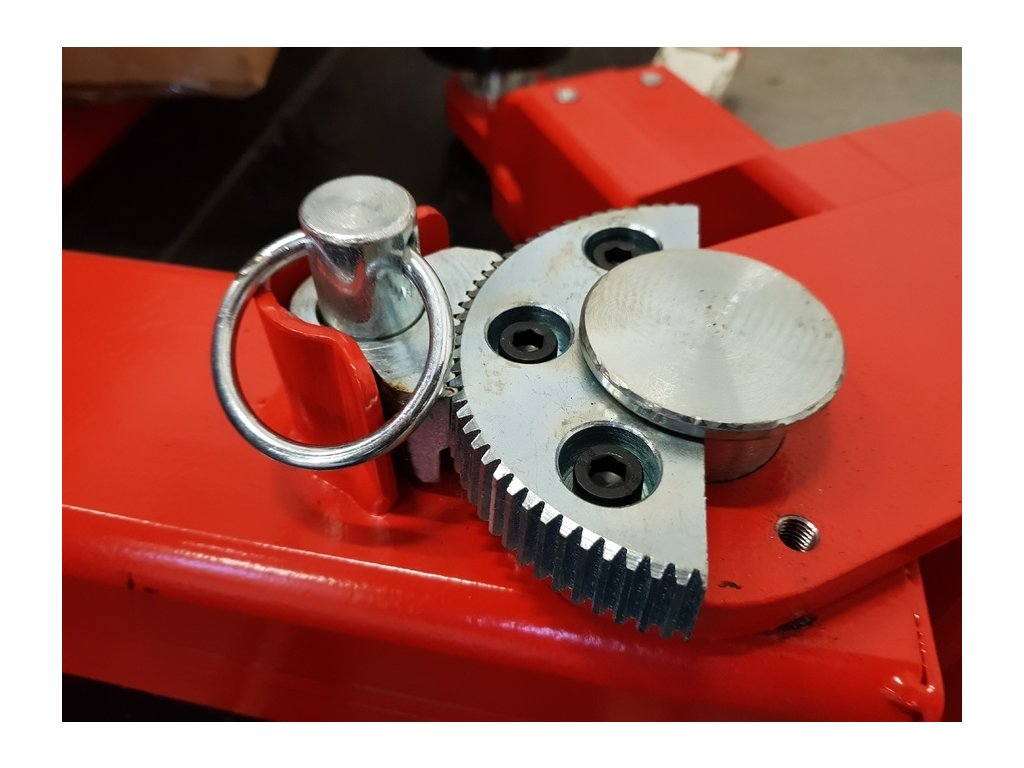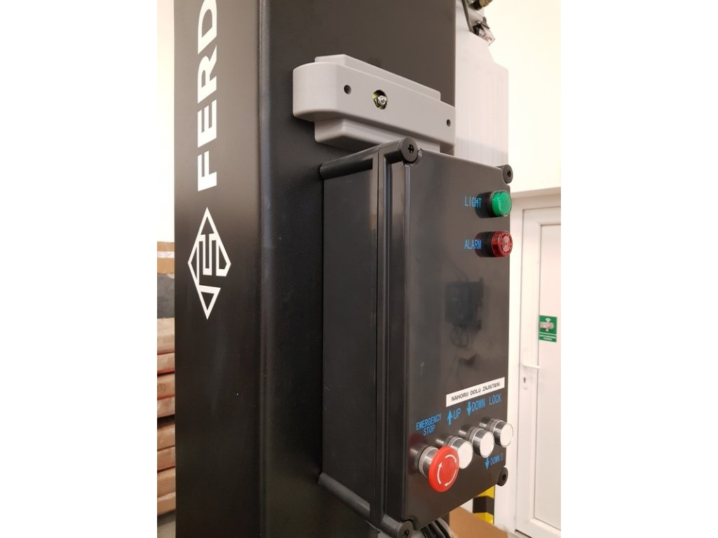 Kromě mechanických západek je hydraulický okruh jištěn průtokovým ventilem, který se při rychlém spouštění zablokuje. Pro bezpečnost obsluhy se při dojíždění do spodní polohy spustí akustická signalizace. Ve vrchní poloze je koncový vypínač.