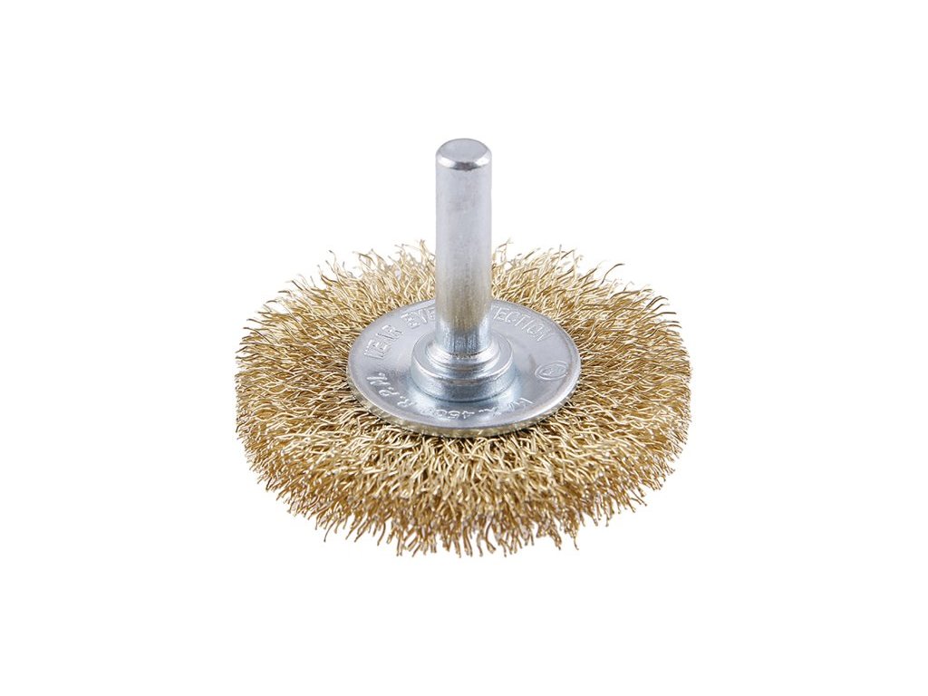 Rotační kartáč - okružní, provedení : vlnitý drát 0,25 mm - pomosazený, průměr 50 mm, stopka 6 x 27 mm, pozinkované tělo kartáče, počet drátů : 936, délka drátu : 12,5 mm, max. přípustné otáčky: 4500 1/min, použití : pro leštění, zdrsňování, ostranění rzi a otřepů, balení : blistr s eurootvorem.Doplňkové parametry