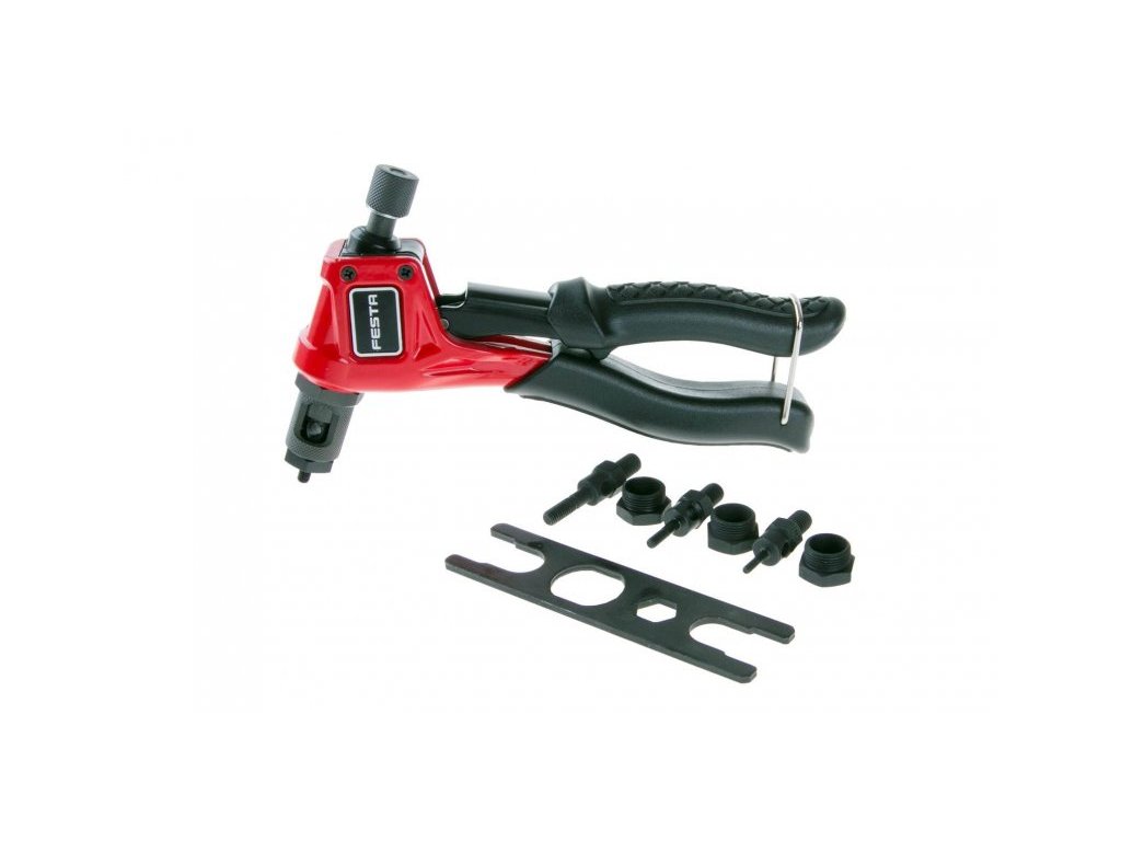 Profesionální nýtovací kleště na nýtovací matice / maticové nýty. Délka 200 mm. Pro matice M3 , M4 , M5 , M6 z materiálů: hliníkové, mosaz, ocelové a z nerezové oceli. Součástí jsou i nýtovací adaptéry 4 ks. Kleště jsou vyrobeny z materiálu Cr-Mo , karbonové oceli a PVC. Pomocí nýtovací matice v zanýtovaném spoji vytvoříte neporušený závit, na který můžete snadno připevňovat další komponenty.Doplňkové parametry