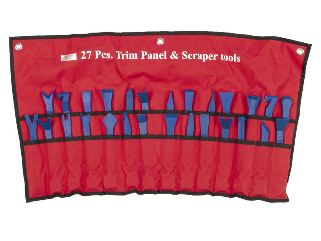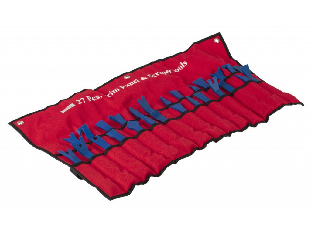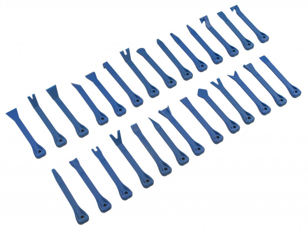 Sada 27 ks profesionálních nástrojů se speciálním profilem na demontáž vnitřních a vnějších příchytek plastových a čalouněných částí automobilů.