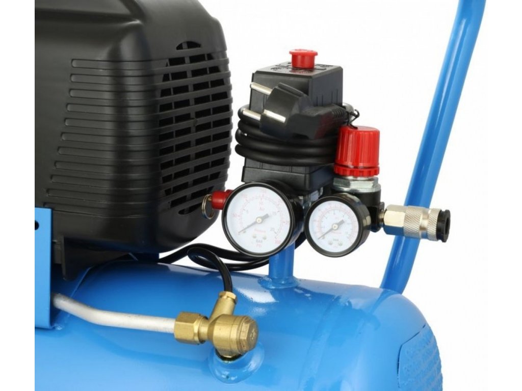Vybavení: 2 manometry, 1 výstup stlačeného vzduchu (→ kovová rychlospojka), tlakový spínač, redukční ventil, pojistný přetlakový ventil, zpětný ventil, olejoznak, vzduchový filtr, 1,4 m přípojný elektrický kabel H05 RR-F.