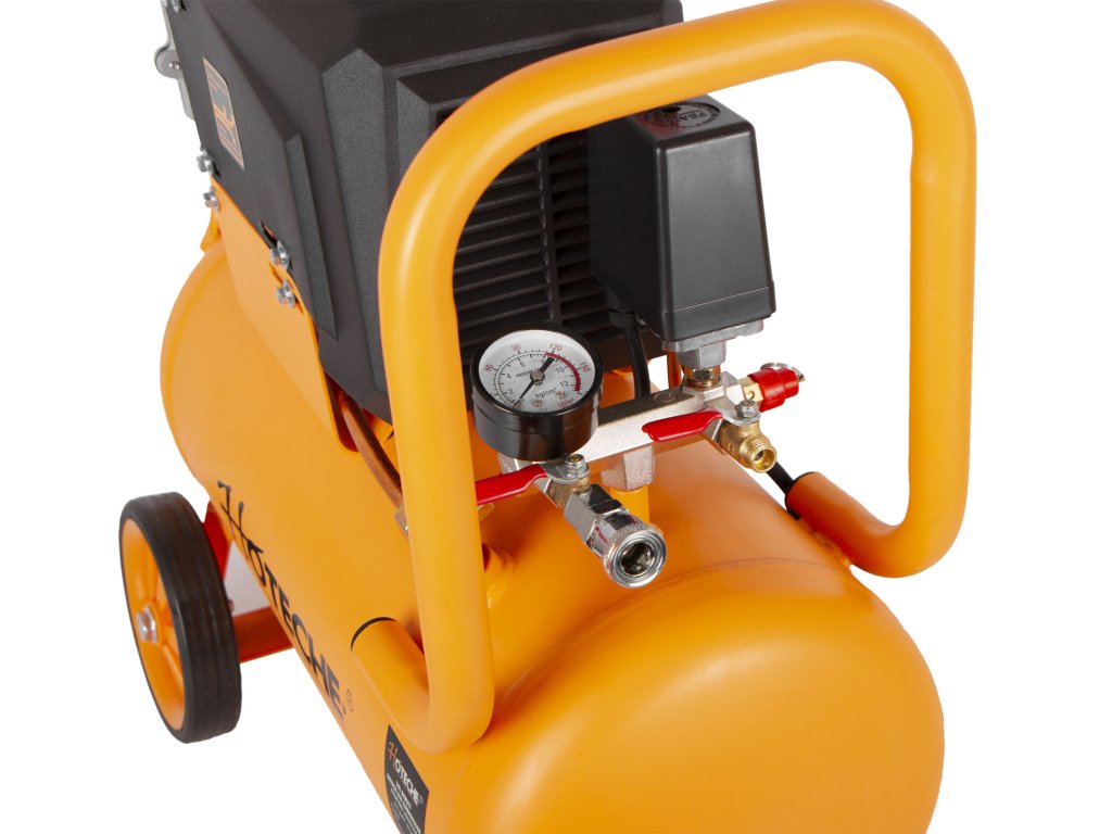 Vybavení: manometr, 2x výstup stlačeného vzduchu (uzavíratelný ventil, rychlospojka), tlakový spínač, pojistný přetlakový ventil, olejoznak, vzduchový filtr.