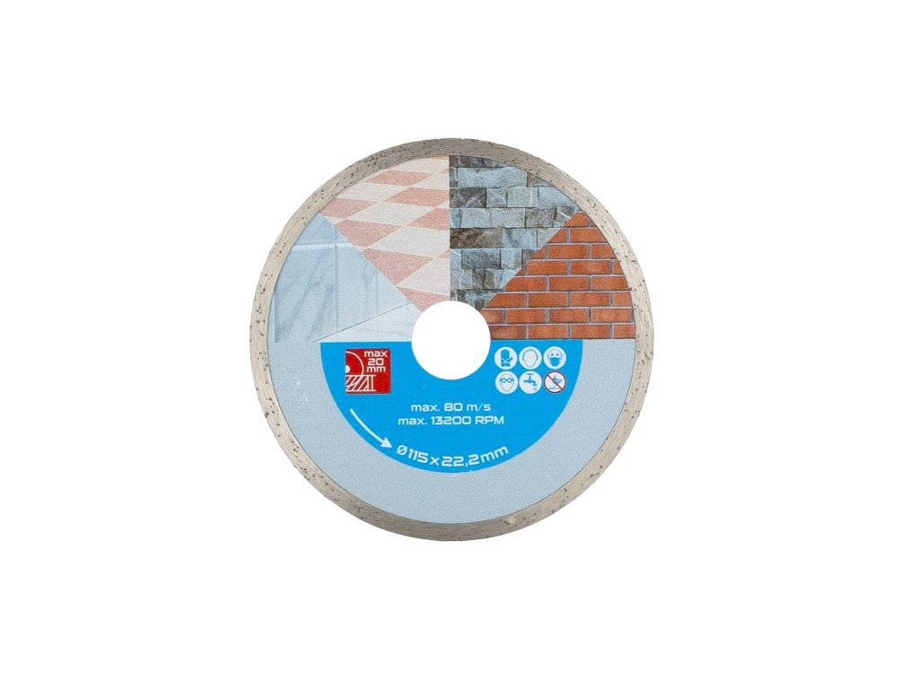 Diamantový kotouč DIAMANT, provedení : PLNÝ - celoobvodový, kvalitní diamantová vrstva s vysokým obsahem diamantového prachu, přesné zpracování - napojení na nosný disk kotouče odolávající vysokým teplotám, použití : určený pro mokré i suché řezání dlažby a obkladů, betonu, cihel, zdiva, žuly, mramoru, kamene, skla, keramiky, balení : blistr s eurootvorem, přiložen redukční kroužek z 22,2 na 20 mm, rozměry : uvedeny v názvu výrobku.Doplňkové parametry