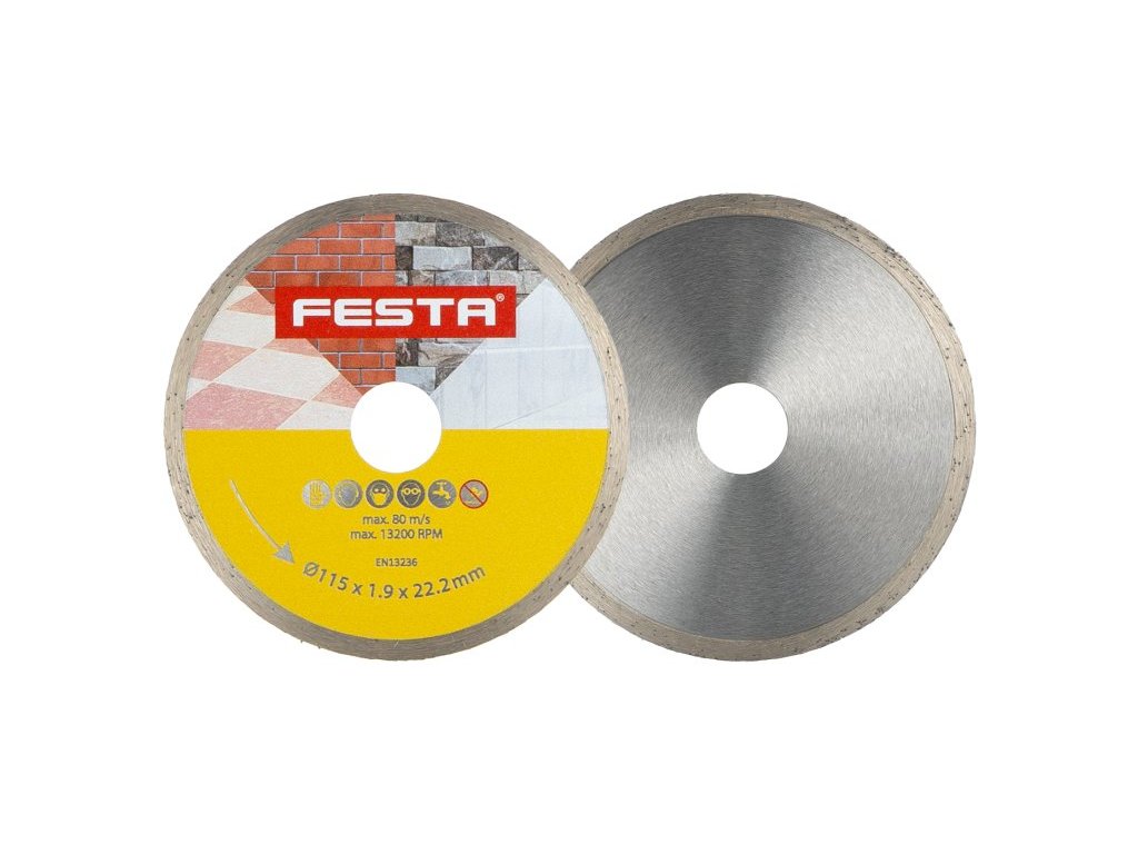 Profesionální diamantový kotouč FESTA, provedení : PLNÝ - celoobvodový, kvalitní diamantová vrstva s vysokým obsahem diamantového prachu, přesné zpracování - napojení na nosný disk kotouče odolávající vysokým teplotám, použití : určený pro mokré i suché řezání dlažby a obkladů, betonu, cihel, zdiva, žuly, mramoru, kamene, skla, keramiky, balení : blistr s eurootvorem, rozměry : uvedeny v názvu výrobku.Doplňkové parametry