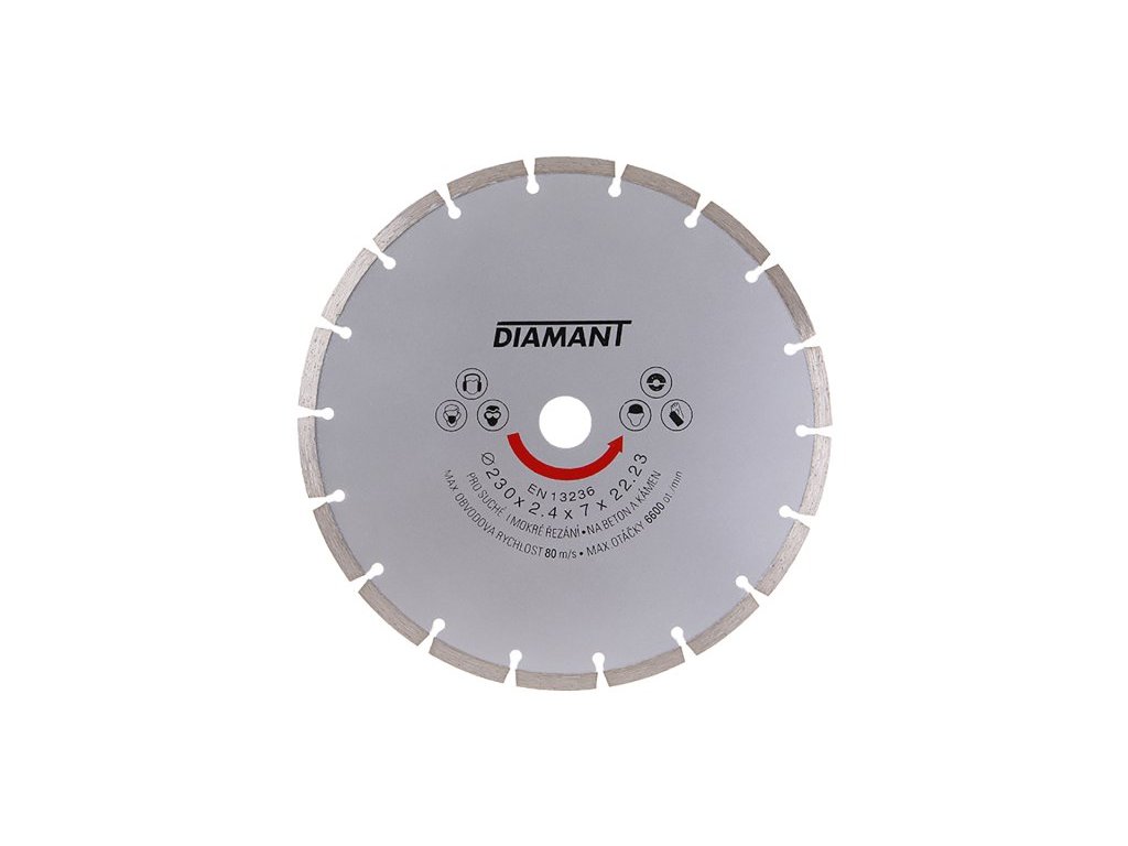 Diamantový kotouč DIAMANT, provedení : SEGMENTOVÝ, kvalitní materiály i zpracování - vysoce pevné uchycení diamantových segmentů k nosnému disku kotouče, vysoký obsah diamantového prachu v segmentech, použití : pro suché řezání betonu, cihel, zdiva, kamene, ... , balení : blistr s eurootvorem, přiložen redukční kroužek z 22,2 na 20 mm, rozměry : uvedeny v názvu výrobku.Doplňkové parametry