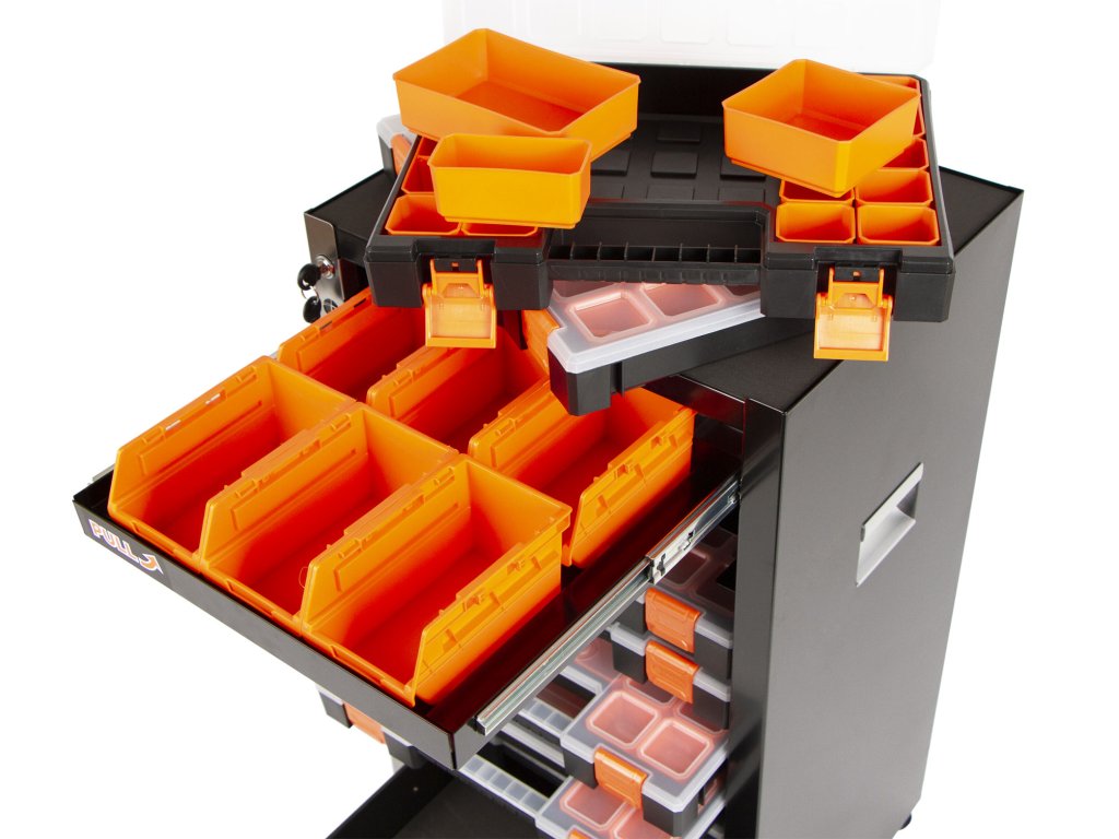 V prostřední části se nachází 9 jednotlivých organizérů, které lze vyjmout a odnést i s materiálem na pracovní místo.