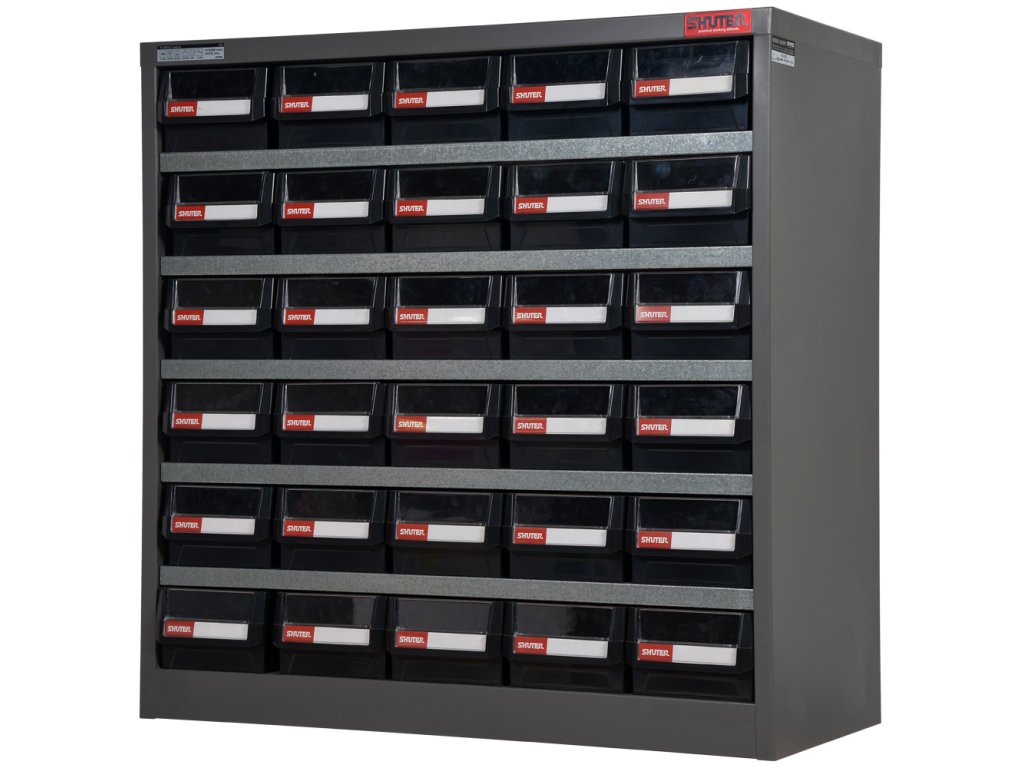 - Dílenský kovový organizér pro uložení montážního materiálu a nářadí s 30 zásuvkami.