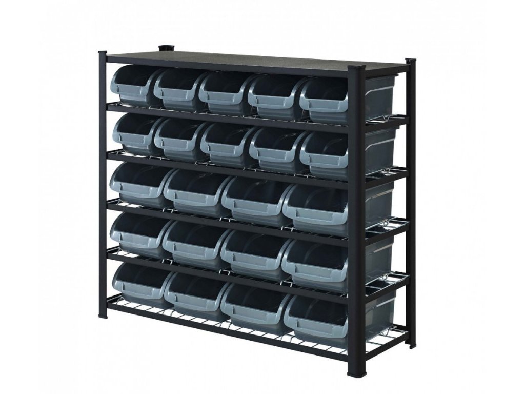 Kovový regál je osazený 6 pozinkovanými drátěnými policemi s vodícími kolejnicemi pro plastové boxy. Samotné uskladňovací nádoby jsou z odolného plastu pro dlouhou životnost a jsou uzpůsobené pro lehké vkládání a odebírání obsahu.