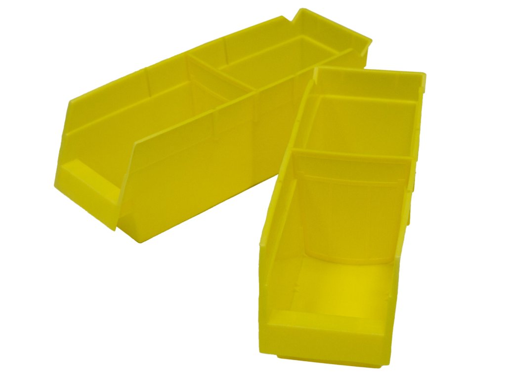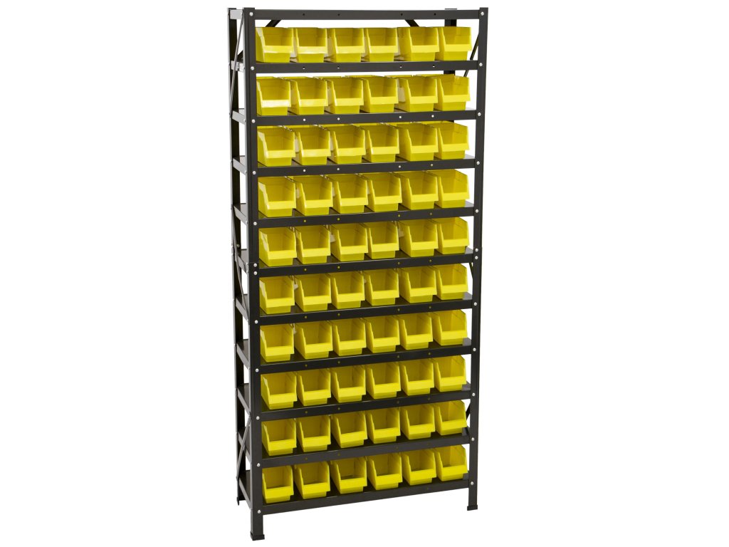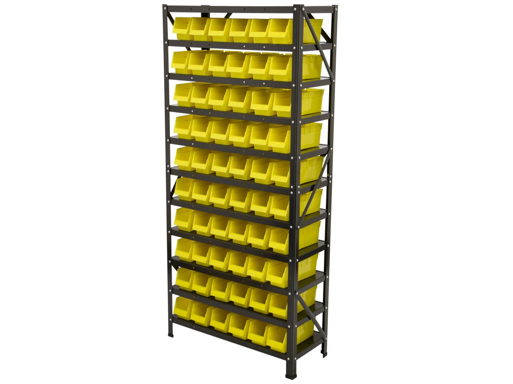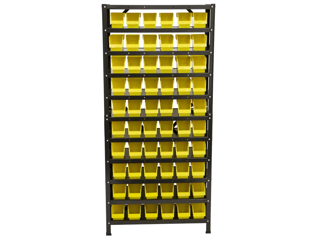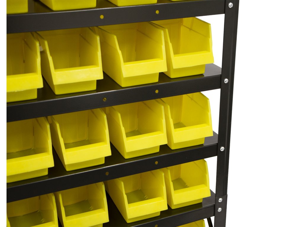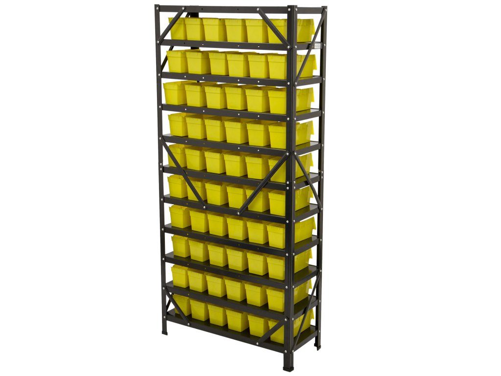 Regál nabízí celkem 60 ks plastových boxů s vnitřními rozměry 85 x 100 x 255 mm.