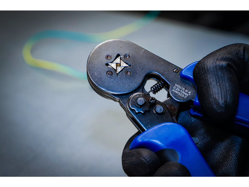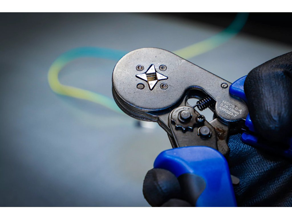 Krimpovací kleště v sadě s přesným čtvercovým upínacím profilem pro kabelové svazky o rozměru 0,25 - 10 mm2.