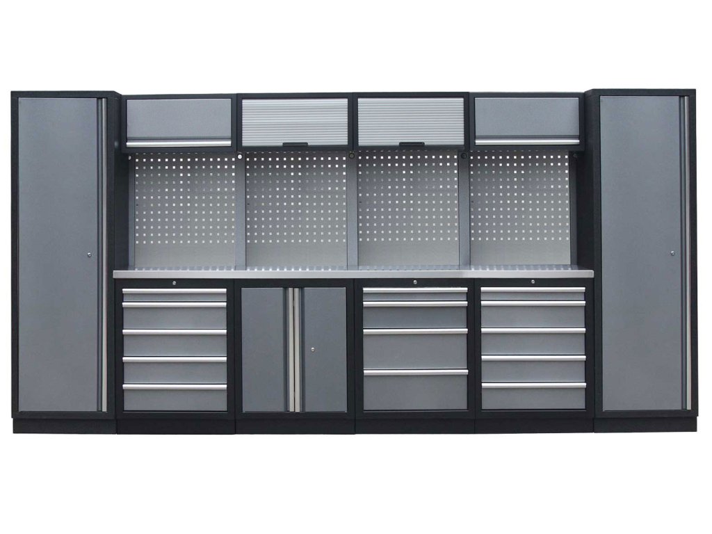 Sestava nábytku v sobě skrývá dostatečné množství úložného prostoru pro vaše nářadí, autotechniku i dílenské vybavení. V kombinaci s bytelnou pracovní deskou získáte multifunkční stěnu, se kterou vám půjde práce od ruky ve všech směrech.