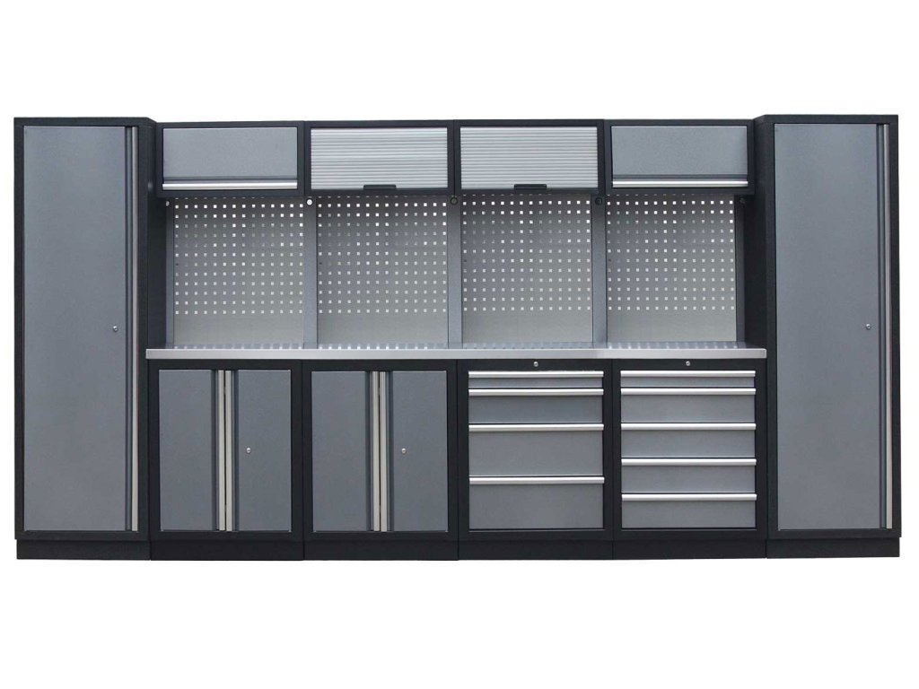 Sestava nábytku v sobě skrývá dostatečné množství úložného prostoru pro vaše nářadí, autotechniku i dílenské vybavení. V kombinaci s bytelnou pracovní deskou získáte multifunkční stěnu, se kterou vám půjde práce od ruky ve všech směrech.