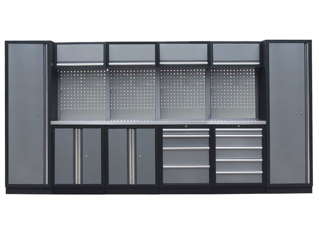 Sestava nábytku v sobě skrývá dostatečné množství úložného prostoru pro vaše nářadí, autotechniku i dílenské vybavení. V kombinaci s bytelnou pracovní deskou získáte multifunkční stěnu, se kterou vám půjde práce od ruky ve všech směrech.
