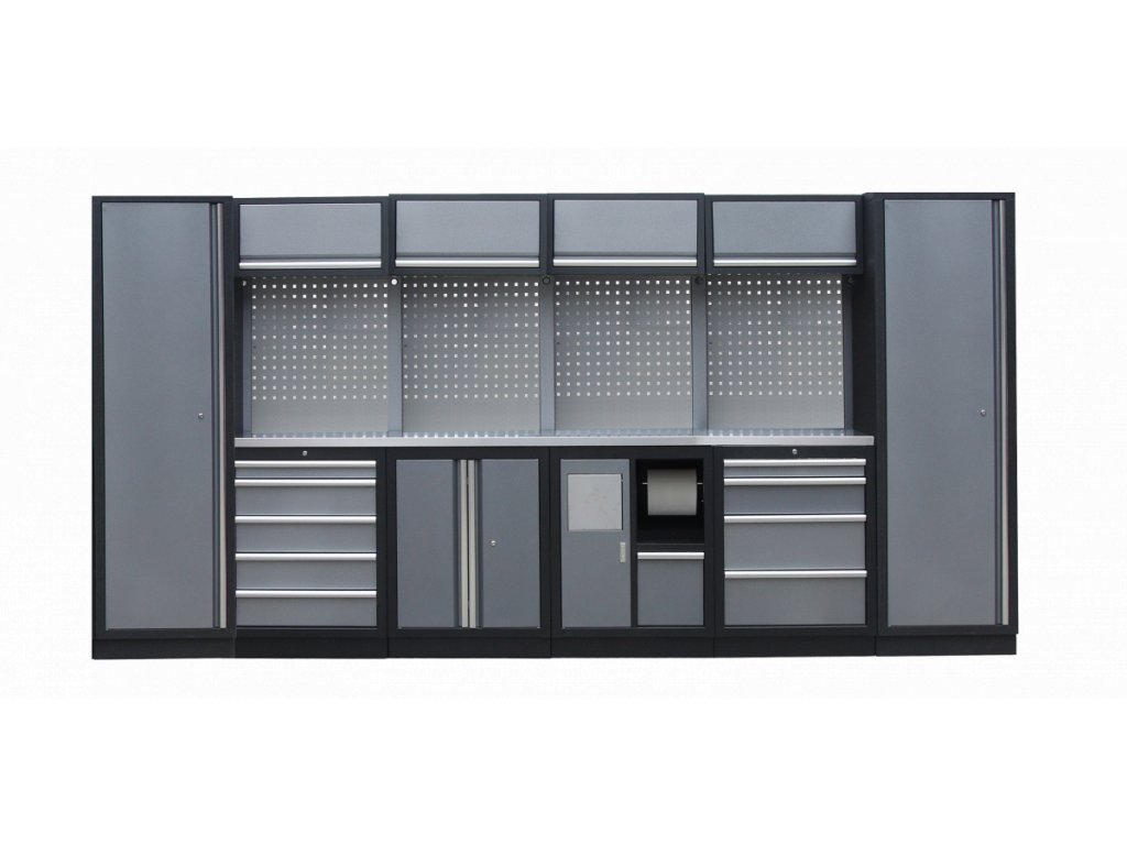 Sestava nábytku v sobě skrývá dostatečné množství úložného prostoru pro vaše nářadí, autotechniku i dílenské vybavení. V kombinaci s bytelnou pracovní deskou získáte multifunkční stěnu, se kterou vám půjde práce od ruky ve všech směrech.