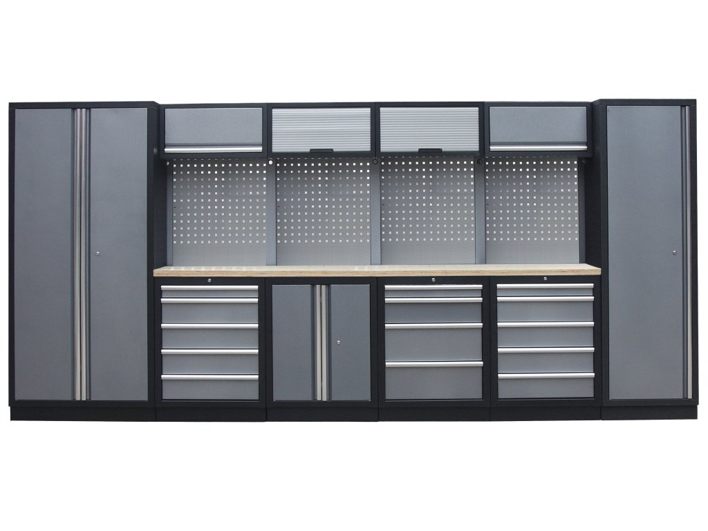 Sestava nábytku v sobě skrývá dostatečné množství úložného prostoru pro vaše nářadí, autotechniku i dílenské vybavení. V kombinaci s bytelnou pracovní deskou získáte multifunkční stěnu, se kterou vám půjde práce od ruky ve všech směrech.
