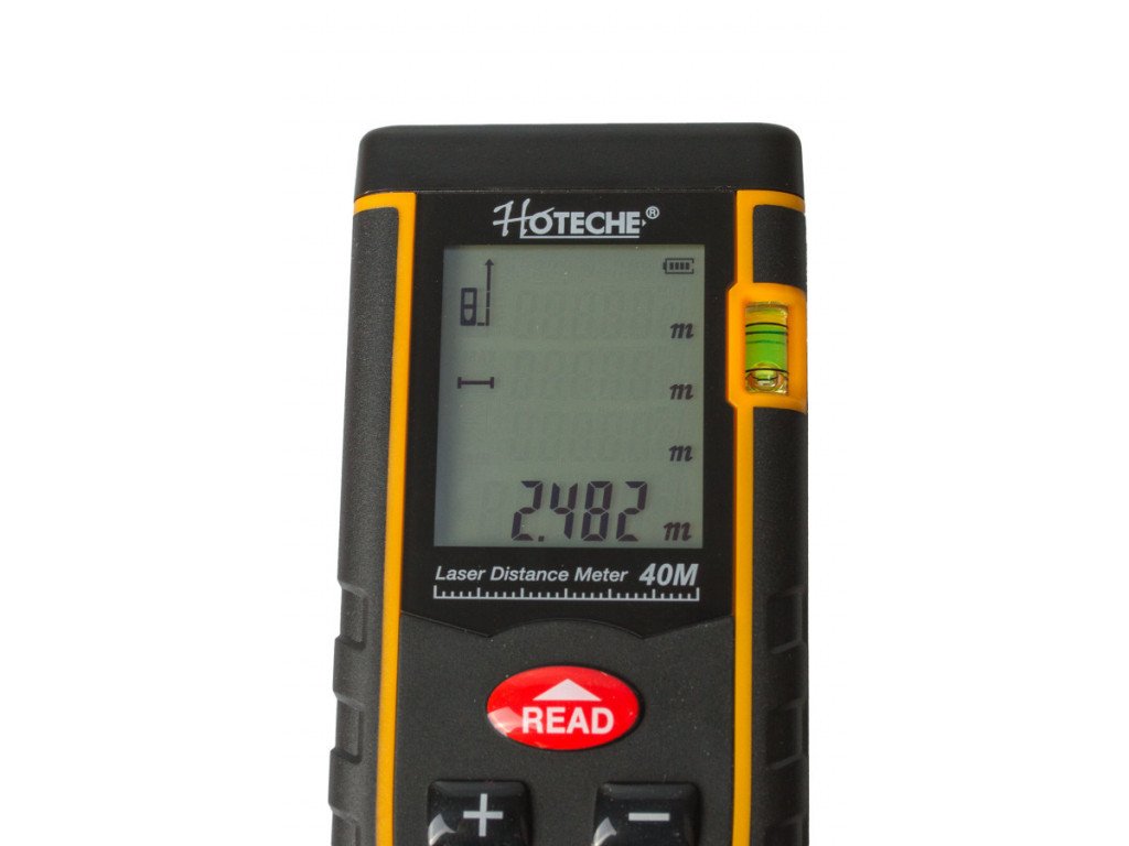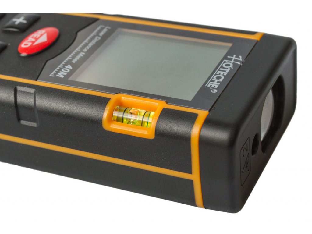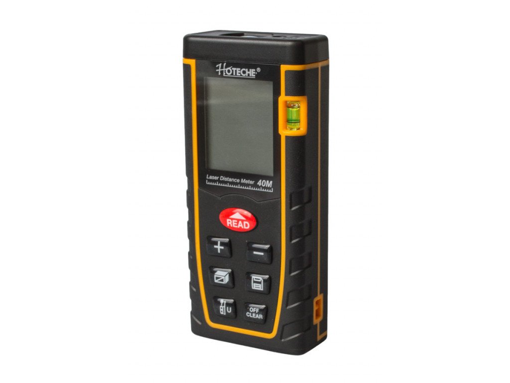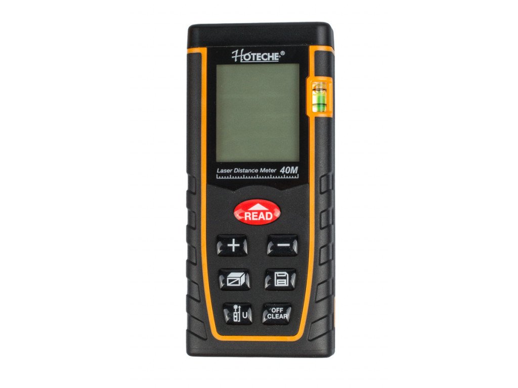Laserový měřič vzdálenosti s pracovním dosahem 40 m značky Hoteche, který je vyroben z plastu a kovu.