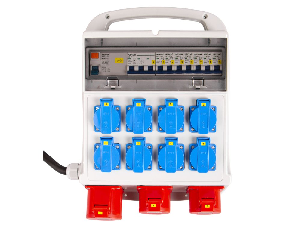 Rozvodná skříň má kabel se vstupem 32 A 5P o délce 130 cm. Dále má 11 výstupů, 8 zásuvek 16 A, 2 zásuvky 16 A 5P a 1 zásuvku 32 A 5P.