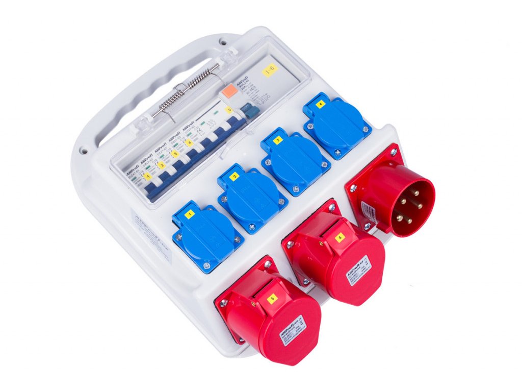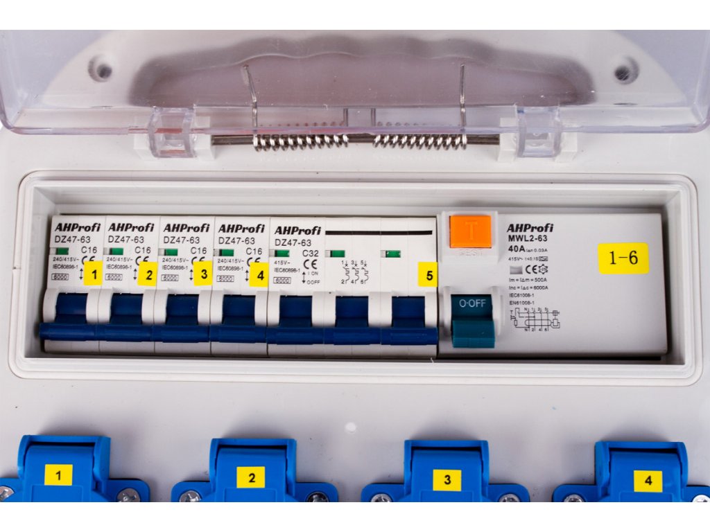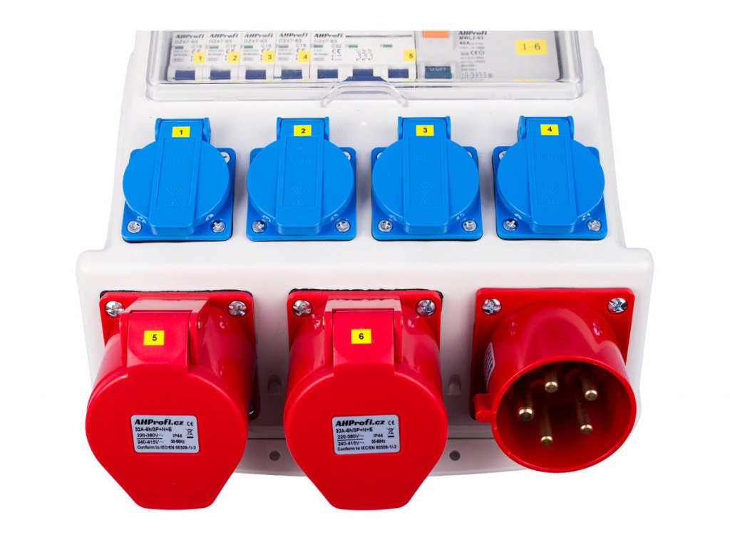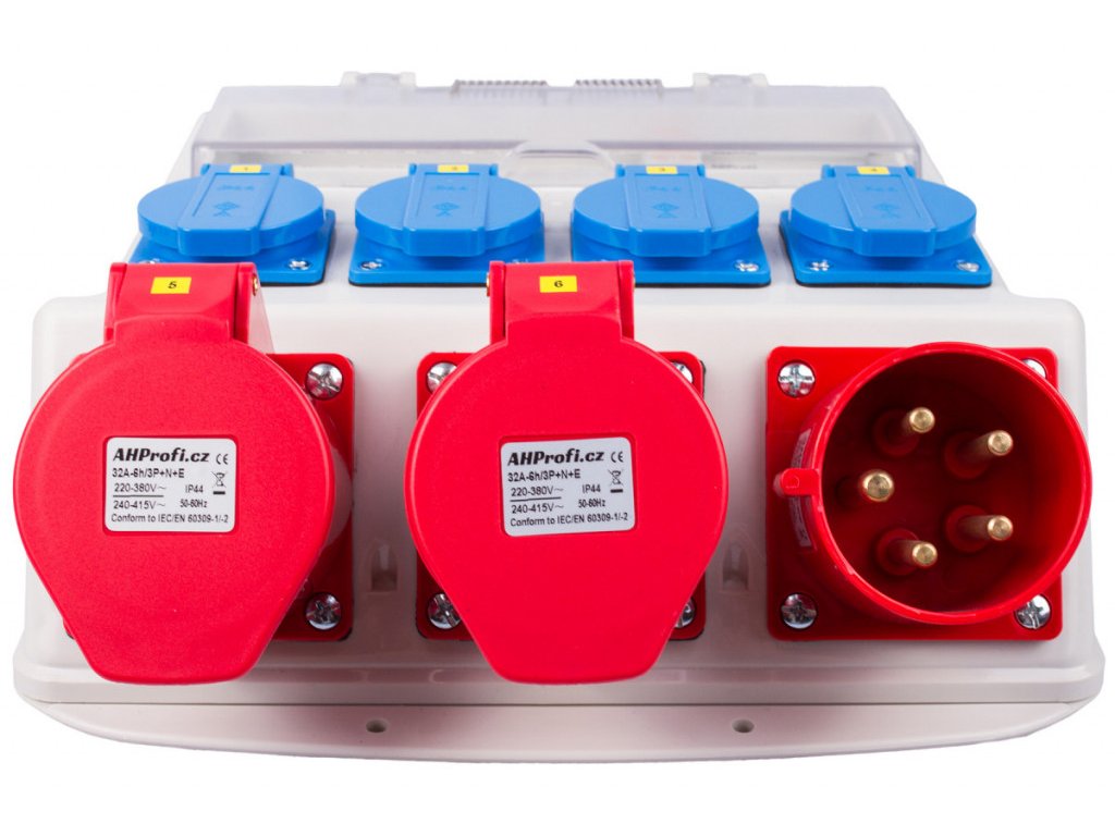 Rozvodná skříň má vstup 32A 5P. Dále má 6 výstupů, 4 zásuvky 16A a 2 zásuvky 32A 5P.
