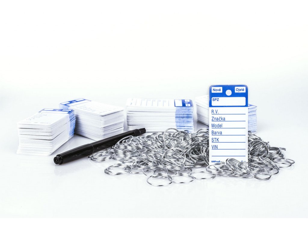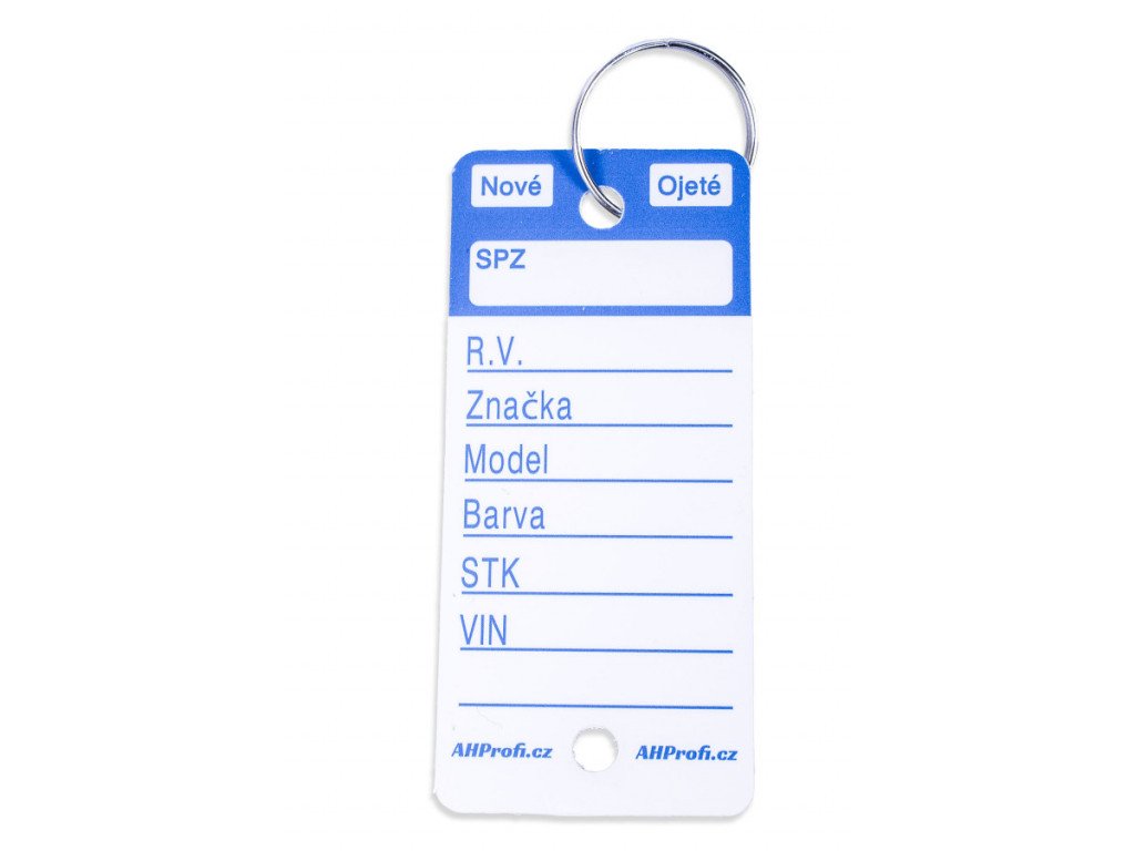Bílé plastové visačky na klíče s modrým potiskem jsou velkou pomůckou převážně pro autobazary, případně autosalony pro snadnou identifikaci klíčů. Jednoduše pak poznáte, kterému autu klíček patří díky vyplněným polím na jmenovce. Permanentním fixem, který je přiložen jako dárek, napíšete na cedulku na klíče SPZ, rok výroby, značku, model a barvu vozu. Datum STK a VIN, zaškrtnete zda se jedná o nové či ojeté vozidlo. Použitím permanentního fixu nemusíte řešit smývání, ušpiněné prsty apod. Na klíče připevníte rozlišovač za pomoci přiloženého kroužku, což může být o trochu složitější než instalace u modelů Easy-ON, nebo Econo ID.