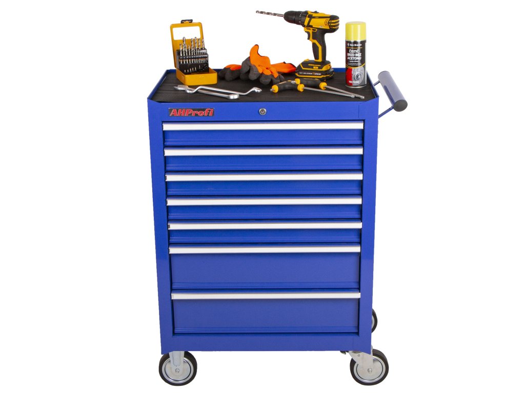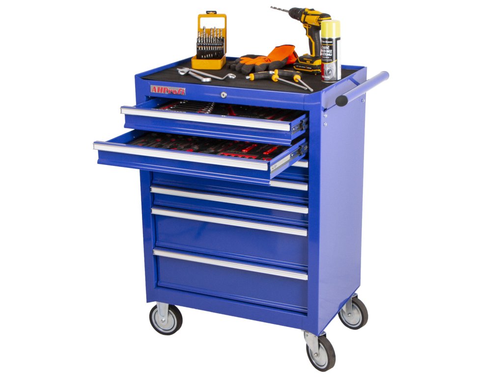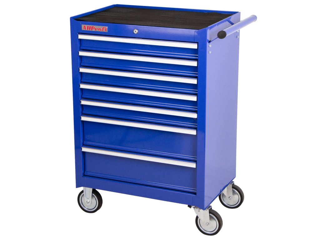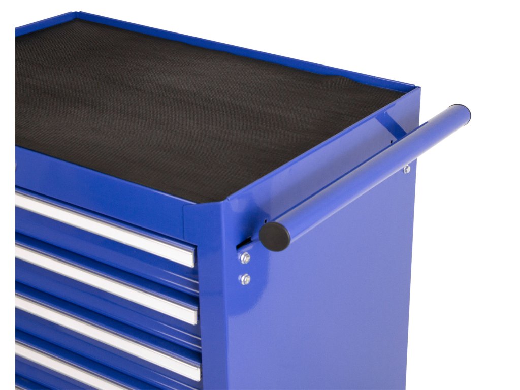 Pojízdný dílenský vozík na nářadí v modrém provedení se 7 zásuvkami, které jsou samozřejmě opatřeny kuličkovými pojezdy a zajištěny proti neúmyslnému vysunutí, se stane hvězdou jakékoli dílny.