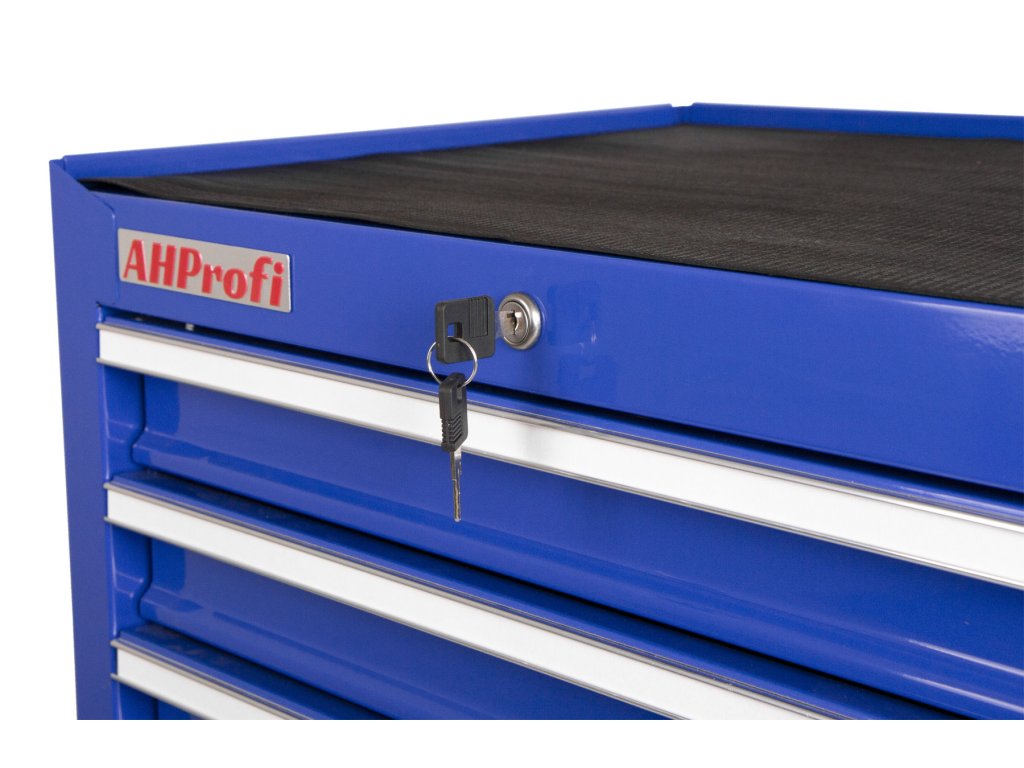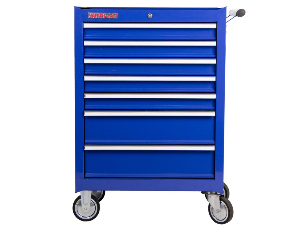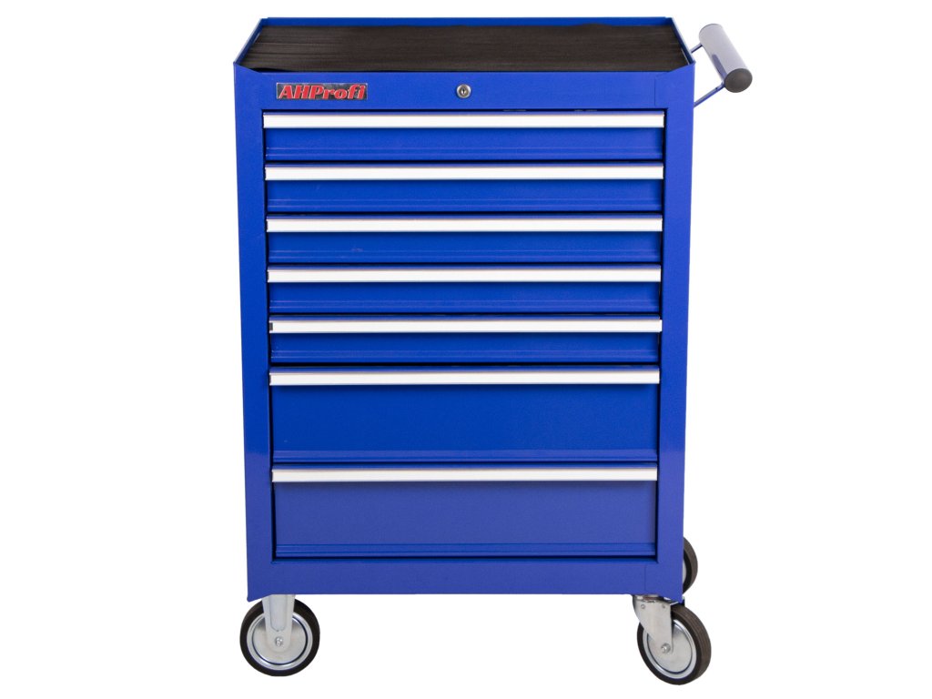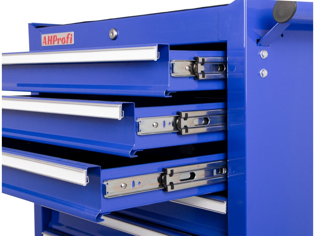 Pojízdný dílenský vozík na nářadí v modrém provedení se 7 zásuvkami, které jsou samozřejmě opatřeny kuličkovými pojezdy a zajištěny proti neúmyslnému vysunutí, se stane hvězdou jakékoli dílny.