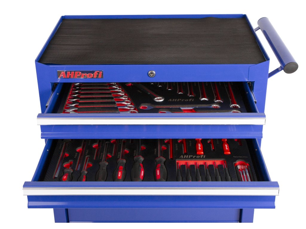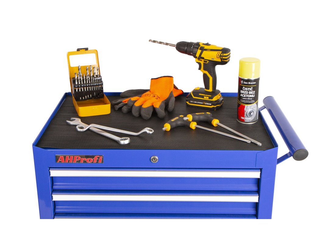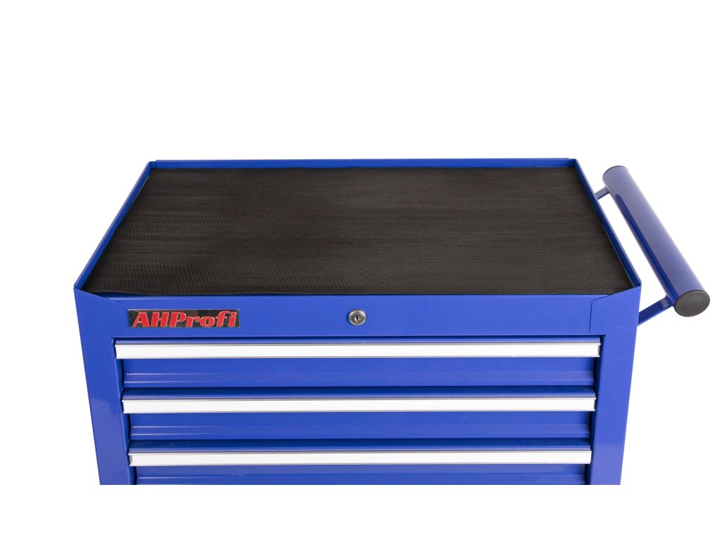 Vrchní deska je dostatečně prostorná (67 x 45 cm) a ze tří stran vymezená lemem pro odložení dílů nebo aktuálně používaného nářadí. Protiskluzová část k ní není záměrně připevněna, aby si uživatel mohl horní desku osadit jakýmkoli jiný materiálem, který mu při montážích vyhovuje a skříňku si tak upravil dle svých individuálních potřeb. Kompletní rozměry dílenského vozíku naleznete v záložce Podrobnější informace.