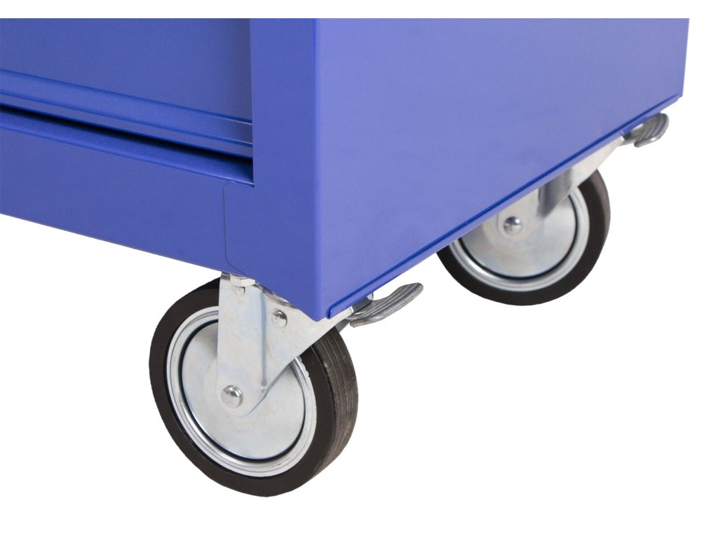 Vozík je opatřen 4 koly, kde 2 z nich jsou otočná na kuličkových ložiscích a vybavená brzdami a není sebemenší problém se skříní zatáčet a dovést nářadí přímo na místo montáže. Odpadá tak čas na neustálé vracení se a zkoumání potřebného nářadí při montáži. Skříň je dodávána složená a je nutné pouze přišroubovat kola a madlo - vše naleznete v jedné ze zásuvek i s potřebnými šrouby a manuálem. Do vozíku je možné přiobjednat i sady s nářadím, které zaručeně zpřehledňují a zrychlují práci. Doplňkové sady nářadí můžete prohlédnout ZDE. Celou skříň je možné uzamknout. V zásilce naleznete také náhradní klíček.