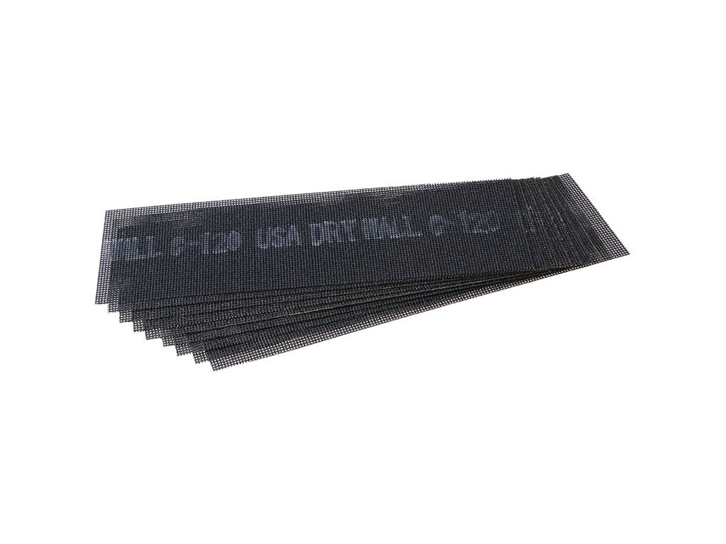 Brusná mřížka 93 x 290 mm, zrnitost 120, 10ks/sada. , nosná tkanina ze skelných vláken, pryskyřicí přilepena brousicí zrna karbidu křemíku nanšena antistaticky, vhodné pro broušení sadrokartonových spárovacích hmot, i dalších materiálů, výhoda mřížkové struktury proti běžným brousicím papírům spočívá v tom, že se nezanáší odbroušeným materiálem.Doplňkové parametry