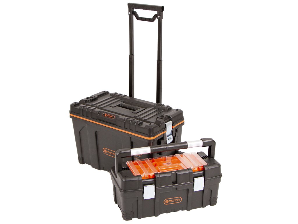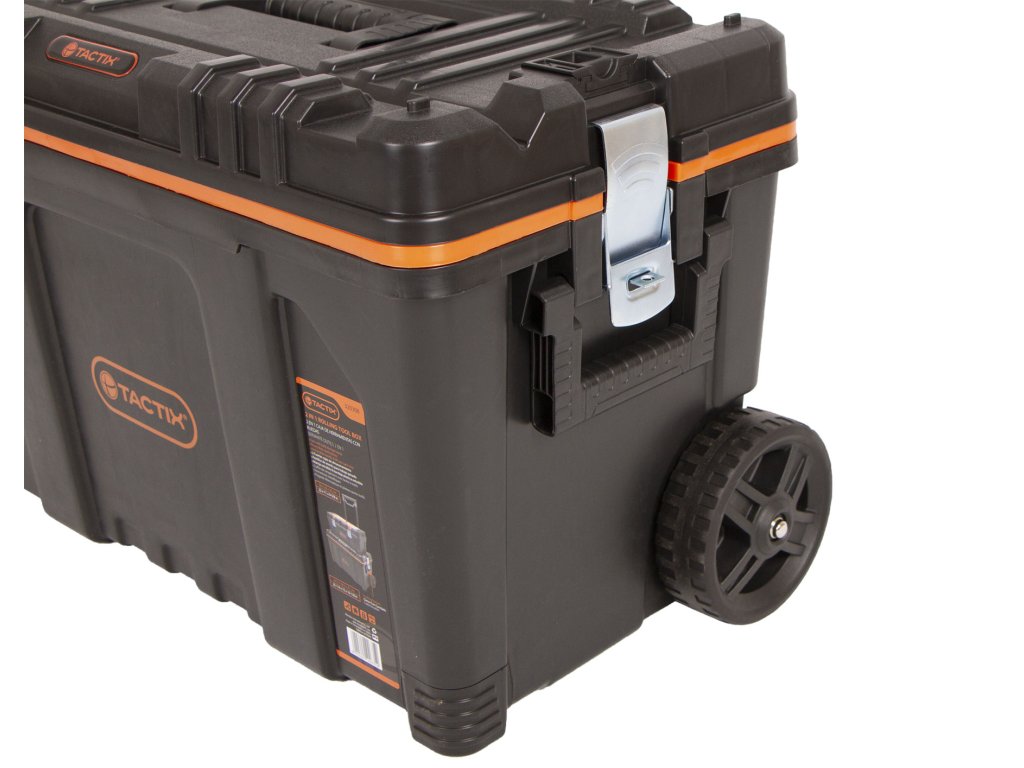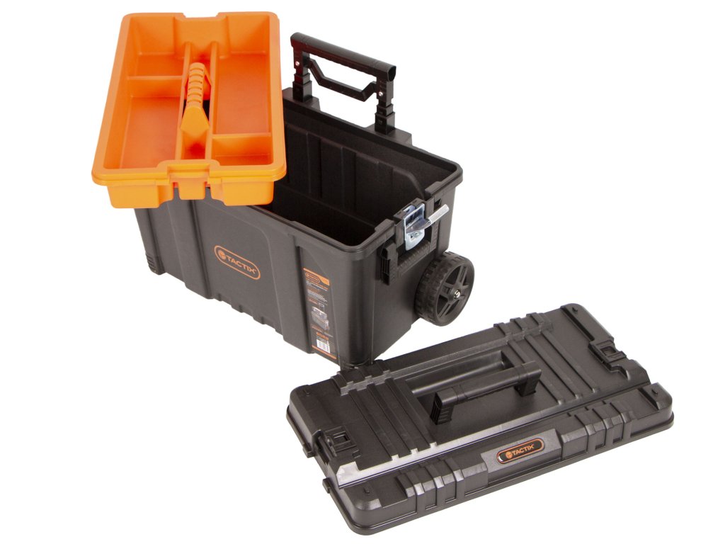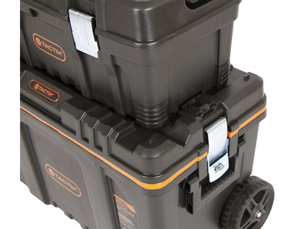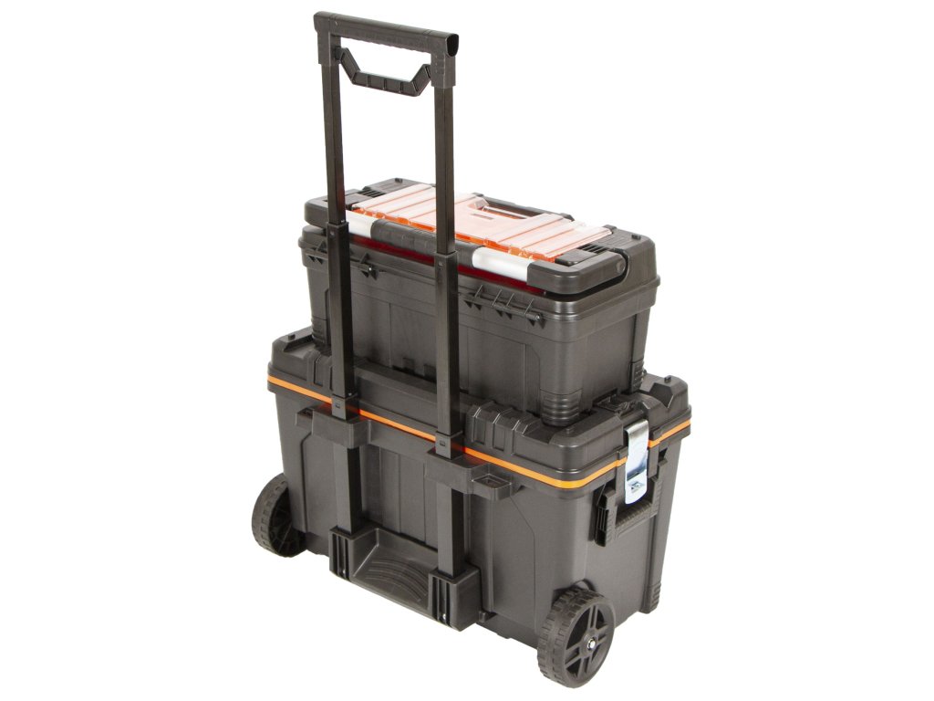 Spodní box je opatřen teleskopickým madlem (90 cm) a kolečky, uvnitř spodního boxu se nachází odnímatelné plato na drobnější materiál a velký úložný prostor.