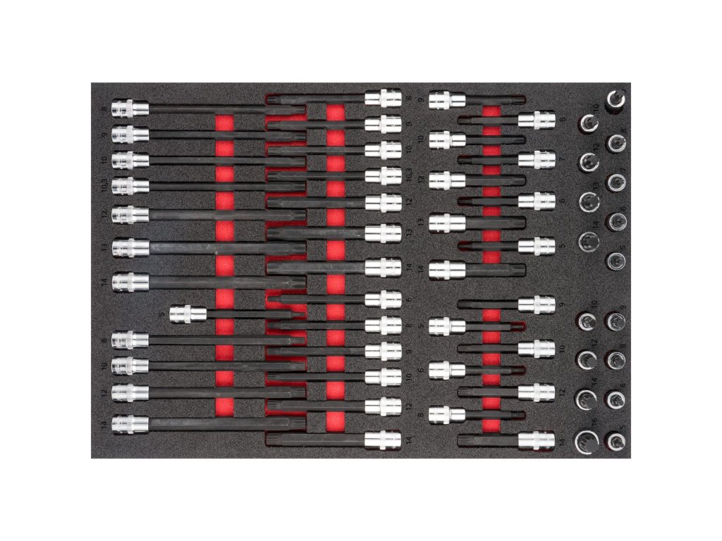 Pěnová vložka o rozměrech (š x h x v) 563 x 393 x 35 mm obsahuje celkem 58 ks profesionálních nástrčných hlavic s bity XZN a RIBE 1/2".
