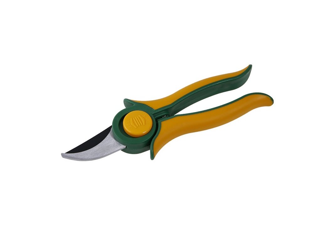 Zahradnické nůžky, nerezová čepel, celková délka 195 mm, středová pojistka k otevírání a zavírání, s půlkulatým břitem.Doplňkové parametry