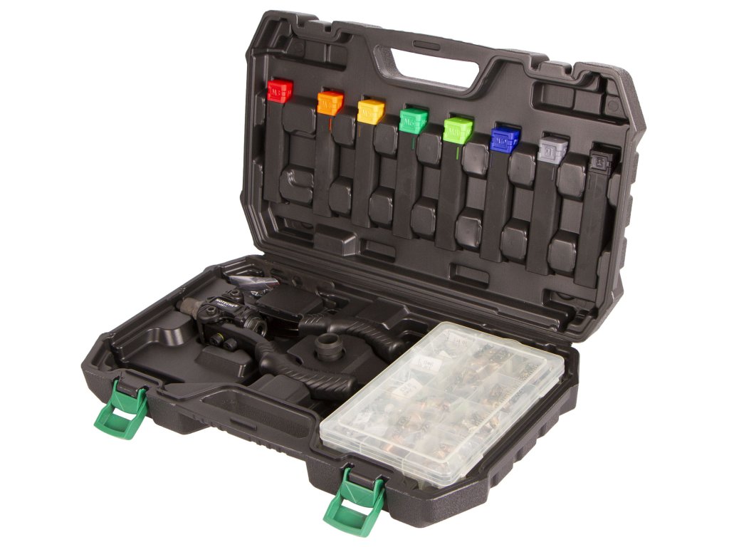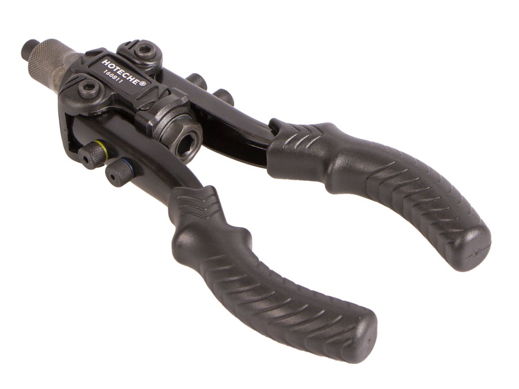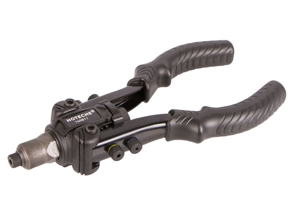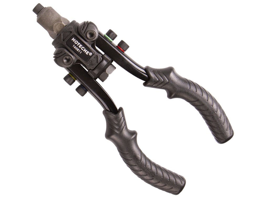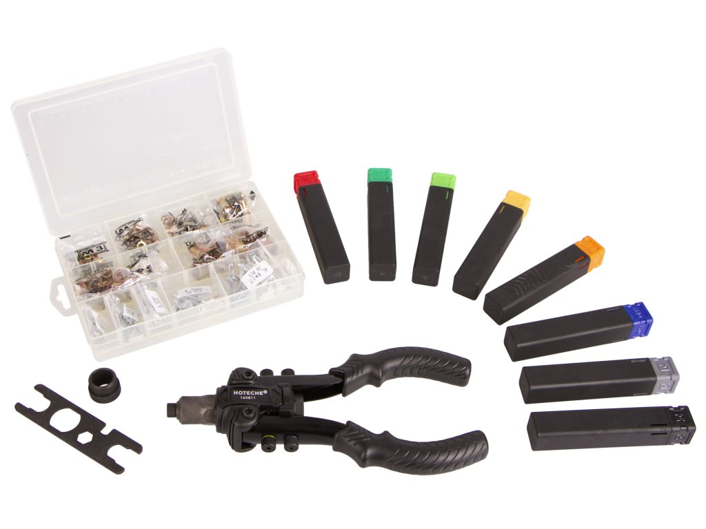 Ruční pákové nýtovací kleště od značky Hoteche v sadě se širokým příslušenstvím.