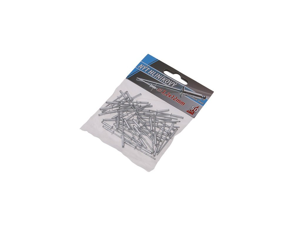 Klasické trhací slepé aluminiové nýty průměr 3,2 mm délka 12mm v malém balení 50 kusů, vhodné pro malospotřebitele.Doplňkové parametry
