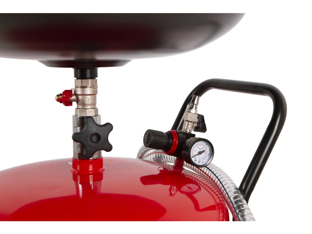 Po naplnění zásobníku se nahromaděný olej vypouští připojením stlačeného vzduchu (0,8 bar), olej vytéká integrovanou hadicí s kovovou koncovkou.