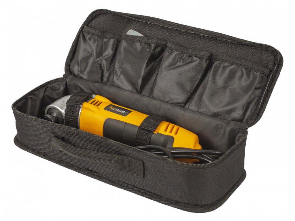Samotná bruska je přehledně a prakticky uložena v látkové brašně společně s příslušenstvím které obsahuje například brusné papíry, škrabku, brusnou podložku a nástroje pro řezání.