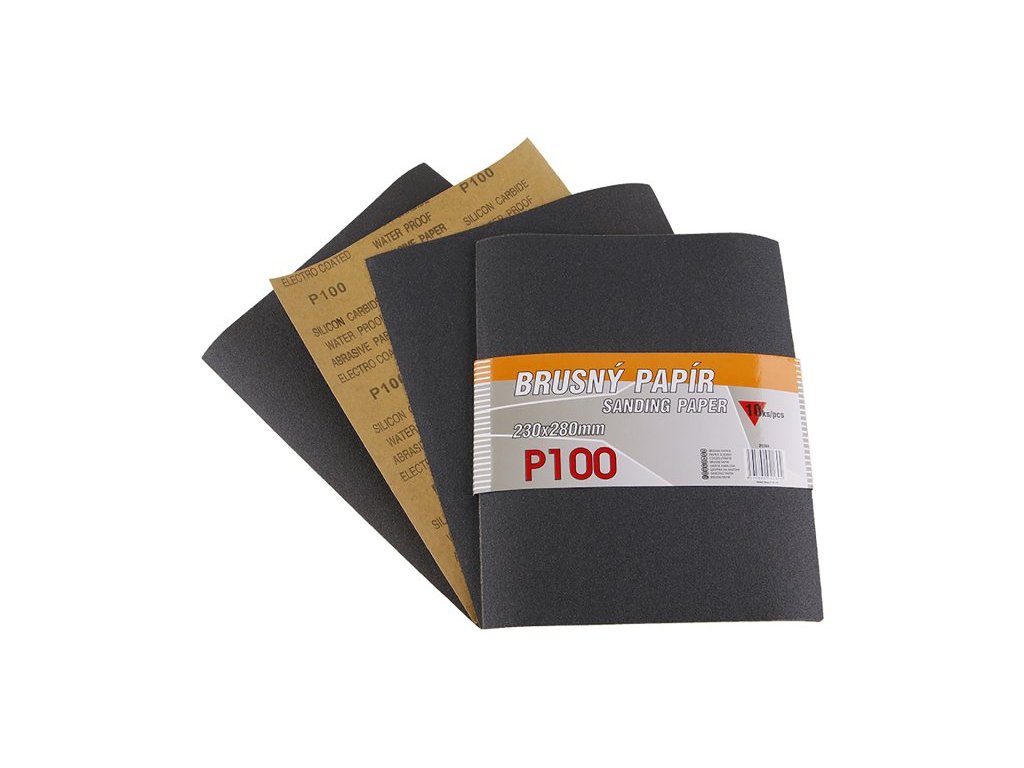 Smirkový papír voděodolný - sada 10 kusů, zrnitost: 100, druh zrna: karbid křemíku, pojivo: syntetická pryskyřice voděvzdorná, podkladový materiál : pružný vodovzdorný papír C (110-135g/m2), rozměry : uvedeny v názvu výrobku, balení : 10 kusů - papírový návlek.Doplňkové parametry