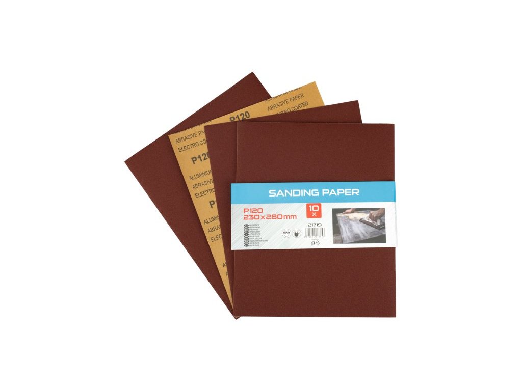 Smirkový papír - sada 10 kusů, zrnitost: 120, druh zrna: oxid hlinitý, pojivo: syntetická pryskyřice, podkladový materiál : pružný papír C (110-135g/m2), rozměry : uvedeny v názvu výrobku, balení : 10 kusů - papírový návlek.Doplňkové parametry