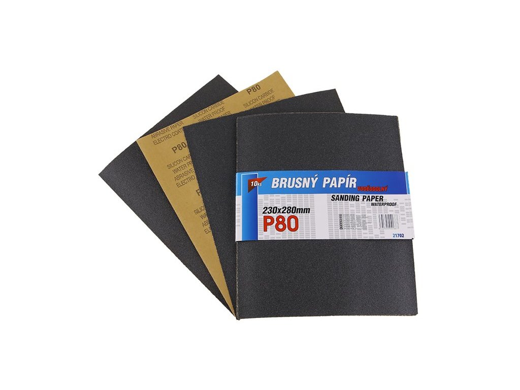 Smirkový papír voděodolný - sada 10 kusů, zrnitost: 80, druh zrna: karbid křemíku, pojivo: syntetická pryskyřice voděvzdorná, podkladový materiál : pružný vodovzdorný papír C (110-135g/m2), rozměry : uvedeny v názvu výrobku, balení : 10 kusů - papírový návlek.Doplňkové parametry