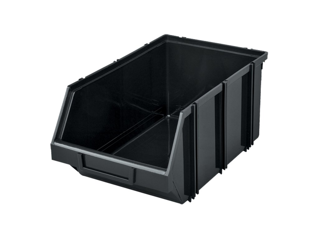 Černý plastový zásobník, stohovatelný. Boční drážky pro sestavení.Doplňkové parametry