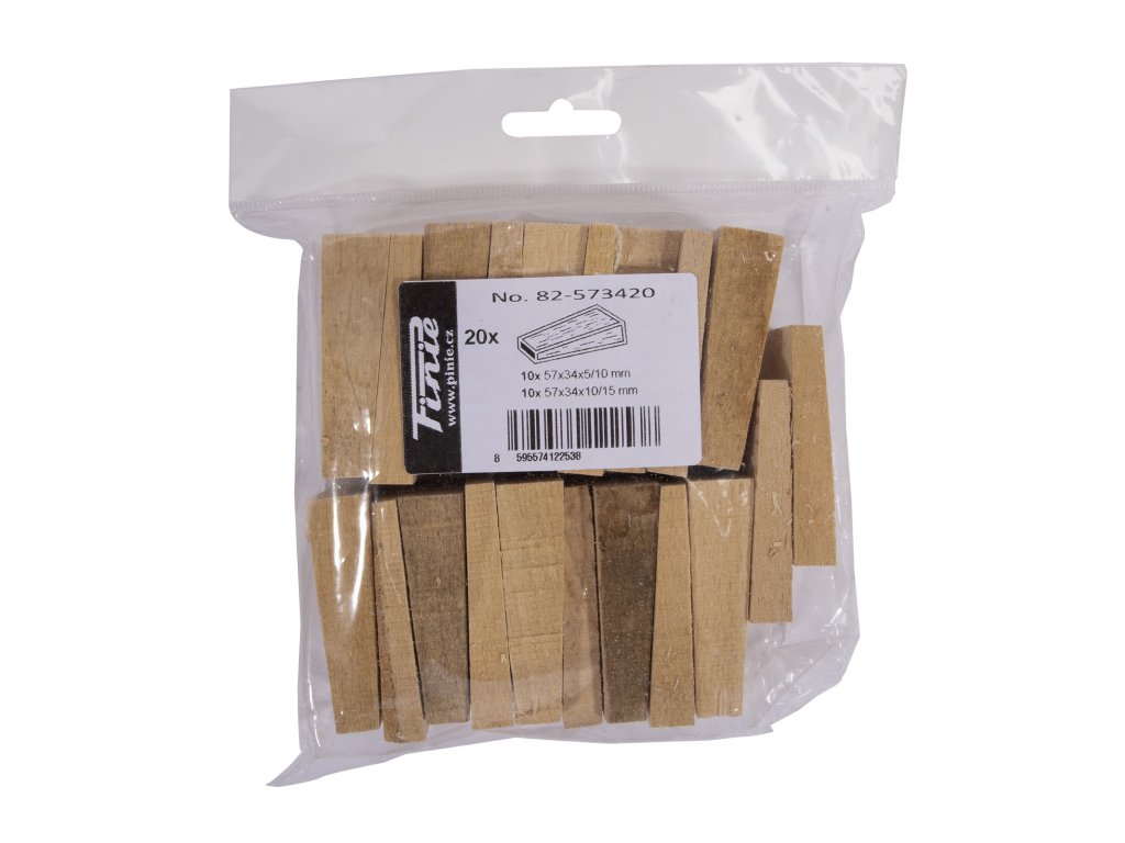 Dřevěné montážní klíny jsou vyrobeny z tvrdého dřeva a jsou vždy řezány ve směru vláken materiálu. Používají se jako dorazové klíny na parkety a k fixaci utahovacích mezer. Sada obsahuje 10 ks o rozměrech 57x34x5/10 mm a 10 ks o rozměrech 57x34x10/15 mm.Doplňkové parametry